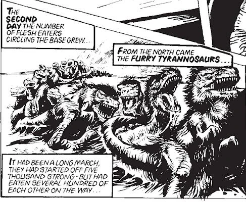 Furry Tyrannosaurs lived to the North of the Trans-Time base and joined with Old One Eye's pack to attack the base[1].