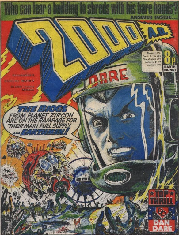 Much like the previous one, this prog continued the opening stories of Dan Dare, Flesh and Harlem Heroes. While Invasion, M.A.C.H.1 and Judge Dredd all had single-episode stories.